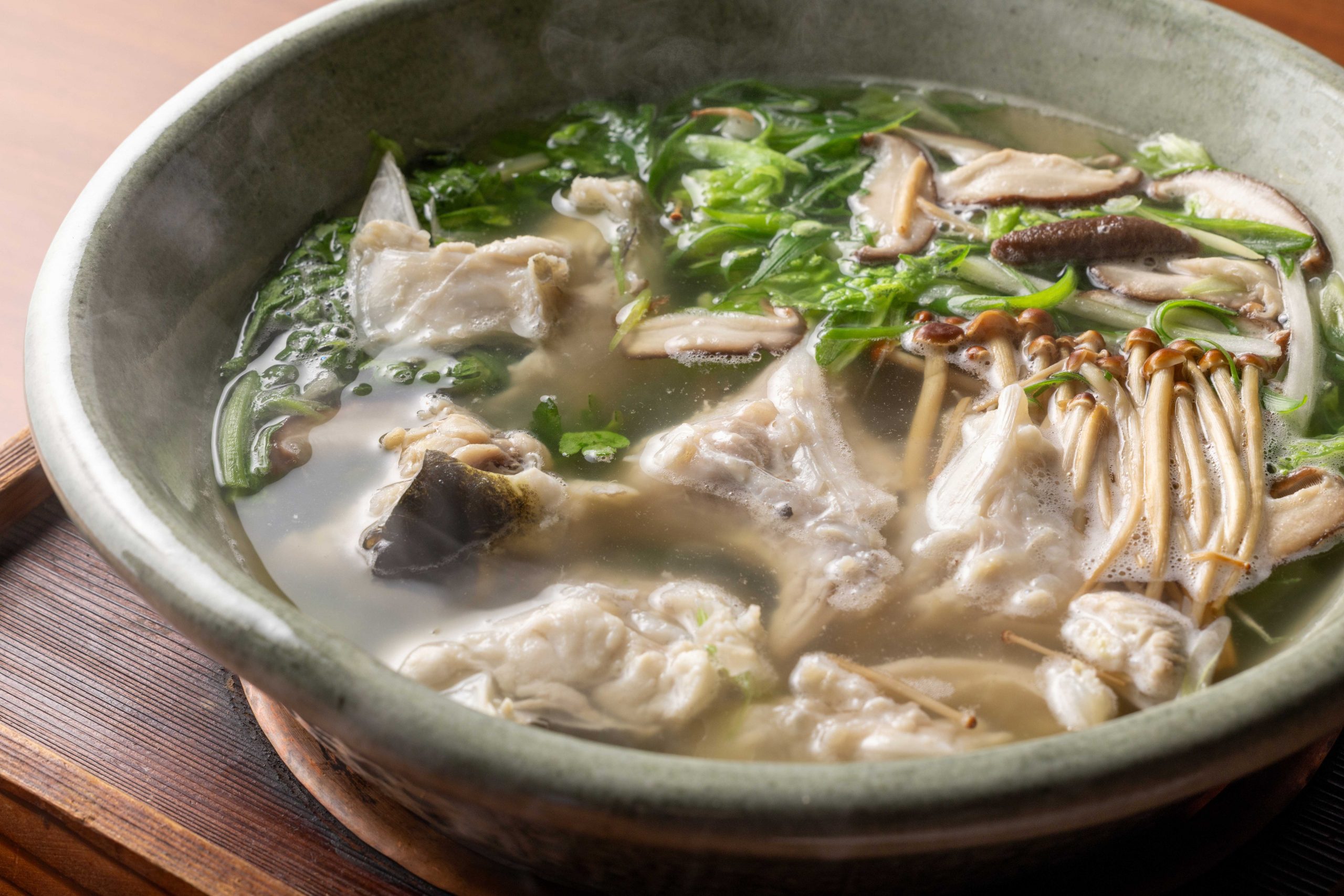 繊細な包丁技が生み出す、均一で美しい薄造りは、しなやかな食感と奥深い旨味が広がります。 鍋料理では、虎河豚のあらから丁寧に引き出した出汁に、厳選した野菜を合わせ、素材本来の滋味を存分にご堪能いただけます。 締めの雑炊は、虎河豚の旨味が凝縮された出汁を余すことなく味わえる、冬ならではの逸品です。